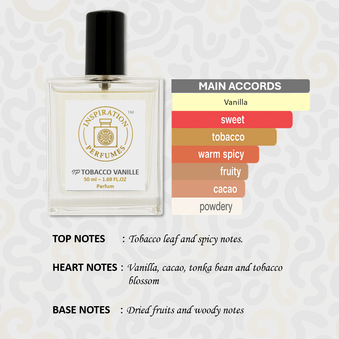 Heart Notes: Vanilla, Cacao, Tonka Bean and Tobacco Blossom